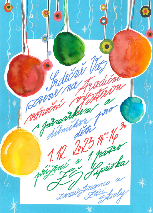 Srdečně Vás zveme 1. 12. 2023 od 14:00 - 16:30 na tradiční vánoční výstavu s jarmarkem a dílničkou pro děti. Akce proběhne v přízemí a 1. patře základní školy.
